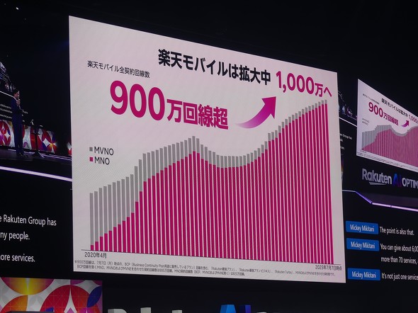 現在、1億超の日本人が楽天IDを持ち、月間4400万人以上が楽天グループで何らかのサービスを利用している。世界では約20億人が利用し、年間6000億から7000億ポイントが発行される。楽天グループ全体で70以上のサービスを提供しており、多くのユーザーは複数のサービスを利用。楽天モバイルは7月7日に900万回線を突破し、年内に1000万回線を目指していることを三木谷氏は述べた。