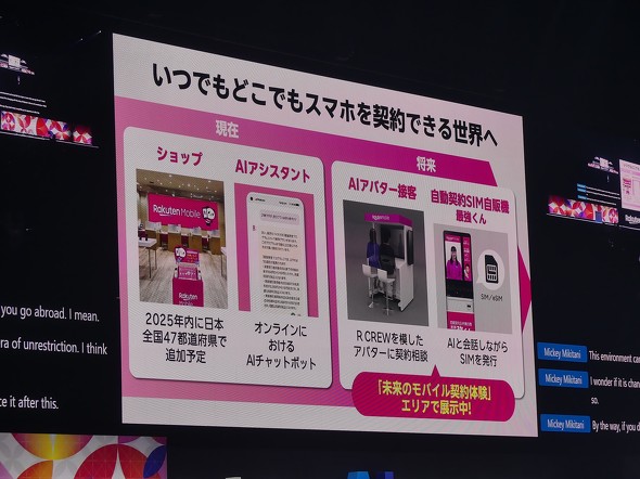 楽天モバイルを契約する際に、AIアバターがSIMの発行や販売を行う「最強くん」と呼ばれる未来の自動販売機についても紹介した。このAIアバターによる接客体験は、エキシビションエリアの楽天モバイルブースで体験できる。