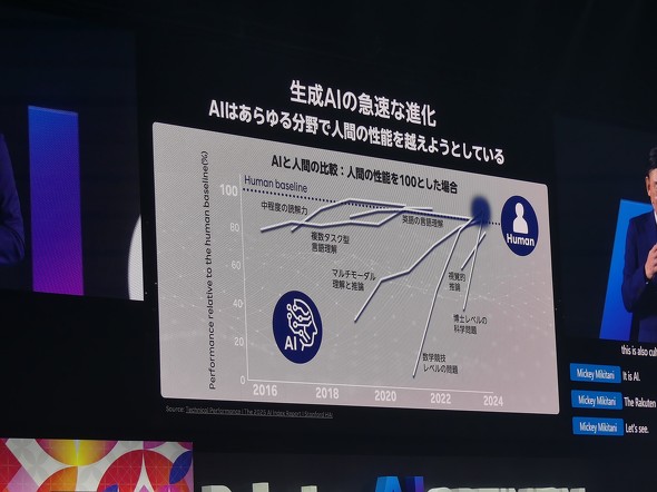 深層学習からLLM、生成AIへと発展してきたAIは、ここ数年間で飛躍的な進歩を遂げている。10年単位で考えられてきた技術の進化が、インターネットの世界では「ドッグイヤー」と呼ばれて3年程度で進むとされたが、AIの進化はそれをはるかにしのぐスピード。「3年くらいで起こると思っていたものが3カ月で起こるほど学習速度が高い」(三木谷氏)。
