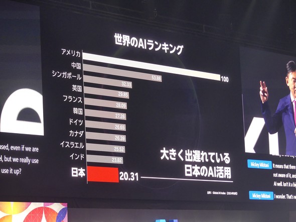 一方で、三木谷氏は日本人のAI活用の遅れを懸念している。AIの普及速度は非常に速く、2025年6月末現在で12億人以上がAIを利用しており、「インターネットやスマートフォンの普及速度と比較しても圧倒的」と指摘。しかし、アメリカを100とすると、日本の「AI力」は20で、中国、ヨーロッパ、韓国、インドよりもはかなり遅れている。特に生成AIの利用率では、中国が80%以上であるのに対し日本は26.7%(2024年末時点)にとどまっている。