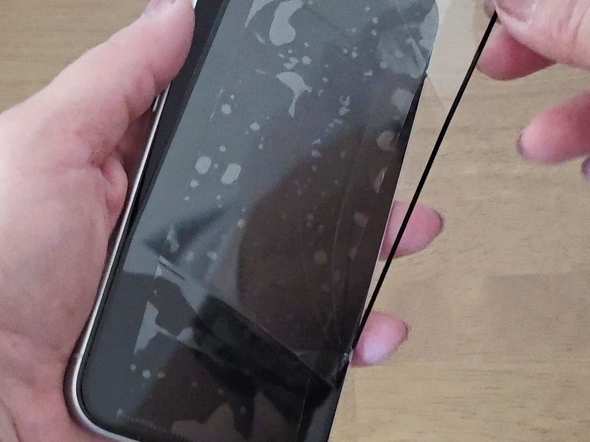 ガイドフレームは、真っすぐ貼り付ける助けになるだけでなく、iPhoneの四方を覆うことでホコリが入り込むことも防いでくれているようだ。ペットを飼っていて、獣毛や細かい羽毛が入り込みやすいという家庭でも扱いやすいのではないだろうか。
