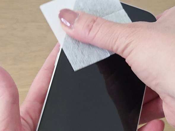 まずはよく拭く。後ほど使うので、ここでクロスを捨てないようにしよう。また、ホコリが付いているようであれば、ホコリ除去シールを使って取り除いておこう。2枚あるので、ガラスフィルムの貼り付け後にホコリに気付いたとしても問題ない真っすぐに貼り付けられず、何度も剥がしているうちにディスプレイとガラスフィルムの間にホコリが入り込んでしまい、がっかりすることの多い作業が、写真を撮影しながらでも、わずか3分で行えた。もちろん、ホコリが入ることもなく、また曲がることもなくきれいな状態だ。