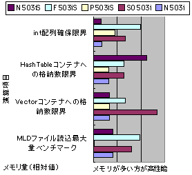 CPUの処理速度については,やはりSO503iの処理速度の速さが目立つ。「F503iS」が前機種「F503i」と比べ大幅に処理速度を上げた(8月23日の記事参照)こともあり,F503iSとN503iSが拮抗する結果となった。 ヒープメモリ