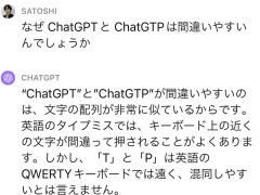 対話型AIサービスでおなじみの「ChatGPT」ですが、時たま、「ChatGTP」と言い間違えているシーンを見かけます。hatGPTの「GPT」とは「Generative Pre-trained Transformer」の略称。なぜ、GPTとGTPを間違えるのでしょうか。無意味だと思いつつもChatGPTに聞いてみました。