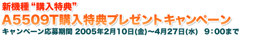 キャンペーンの応募に関する注意事項 ※ドメイン指定受信の設定をしている方は、「@ivcreation.com」を追加してください。 ※T-UCSへの会員(無料)登録が必要です。 ※キャンペーン末日までに A5509Tをご購入頂き、ご応募いただいた方のみ対象となります。 ※複数回ご応募されても、2回目以降の応募は無効となります。