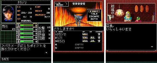 デジタルデビル物語 女神転生は、1987年にナムコからファミリーコンピューター用ゲームソフトとして発売された同名タイトルを、BREWアプリに移植したもの。オリジナルのテイストを維持しつつ、グラフィックの改善、オートマッピング機能やどこでもセーブ可能な機能の搭載など、システムの強化を行っている。対応機種は「W21K」「W31K」「W32K」「A1403K」。ほかの端末へも随時対応する。