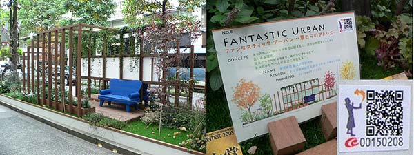 丸の内仲通りガーデニングショー2005の受賞作品。15人の作家が作品を展示している(左)、作品にはCCコード付きの解説ボードが添えられている(右)、QRコードにCCナンバーを組み合わせたCCコード(右下)