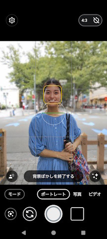 背景ぼかしボタンをタップすると「ポートレート」モードに切り替わる。ポートレートモードにしないにしても、その場で切り替えるスイッチが出るってのは親切だと思う。
