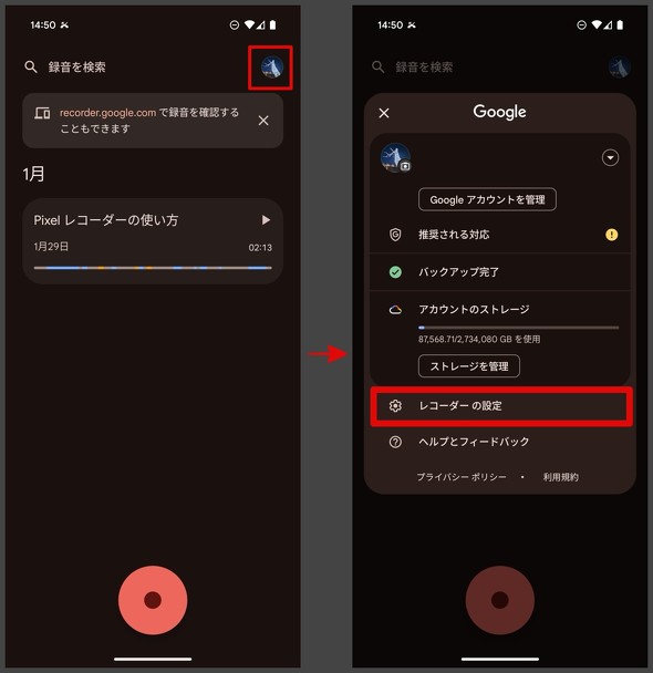 では、実際にレコーダーでできることを順に紹介する。まず前提として、レコーダーで録音したデータがどこに保存されるのかを確認しよう。端末のストレージかGoogle アカウント(クラウドストレージ)かの二者択一だ。初期設定の画面で選べるが、設定を変更するには、Google アカウントのアイコンをタップし、「レコーダーの設定」→「バックアップと同期」→バックアップと同期の項目をオンに切り替え、バックアップアカウントの選択へ進む。