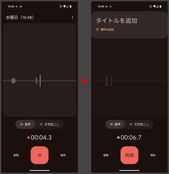 これを踏まえた上で、ここからは基本的な使い方を見ていく。音声の録音を行うには、画面の下にある「赤色の録音」ボタンをタップする。本ボタンをもう1度タップすると、録音を一時停止できる。保存する場合は、録音ボタンの右側にある「保存」をタップするだけでいいが、「タイトルを追加」をタップして任意の名前や数字を入れておくと、後から管理しやすくなる。録音を保存したくない場合は、録音ボタンの左側にある「削除」をタップしよう。