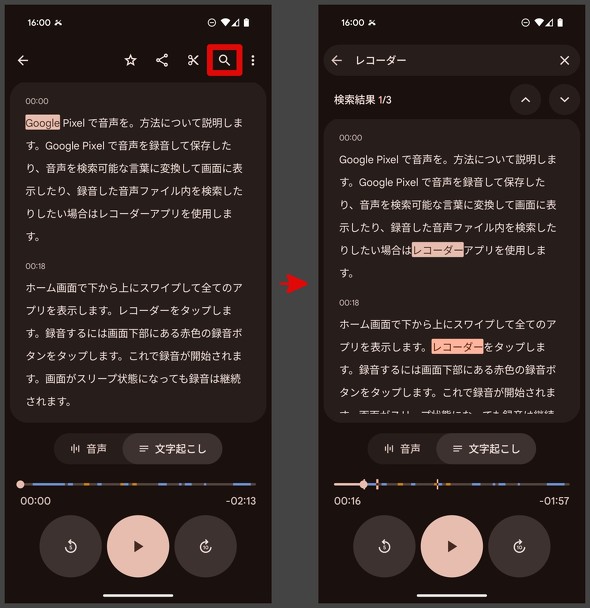 文字を選択すれば、その部分から聞き直すことが可能だ。虫眼鏡の「検索」マークをタップして、任意の言葉を入力すれば、それに該当する言葉のある録音部分が表示される。