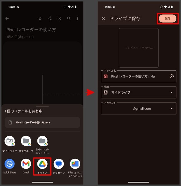 共有のメニューを開いたら、「ファイル」を選択して、音声かテキストのどちらかを選択する。すると、ファイルをどこに共有するのかを選択できるようになる。ドライブなら「ドライブ」を選べばいい。Gmailに添付したり、ファイルに保存することも可能だ。テキストファイルの共有も同じ手順で行える。