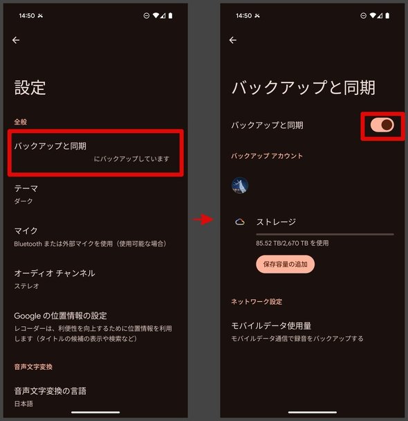 そのため、レコーダーで録音したデータの保存先を、端末のストレージではなく、Google アカウント(クラウドストレージ)に設定しておく必要がある。PixelのレコーダーからGoogle アカウントのアイコンをタップし、「レコーダーの設定」→「バックアップと同期」→バックアップと同期の項目をオンに切り替え、バックアップアカウントの選択へ進む。