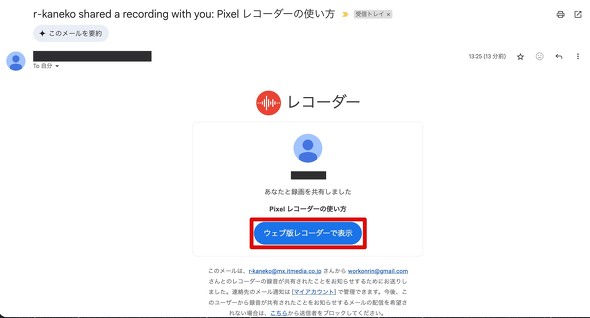すると、相手には「shared a recording with you(あなたと録音を共有しました)」という表題のメールが送信される。このメールを受け取った人は、メール本文の中央にある「ウェブ版レコーダーで表示」をクリックすれば、共有された録音データを確認できる。文字起こしのデータも含まれるので便利だ。