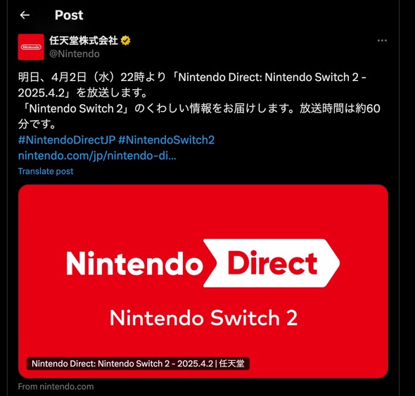 任天堂は、Nintendo Switchの後継モデル「Nintendo Switch 2」の詳細を4月2日に発表すると案内している。放送時間は約60分となっており、前回のおよそ倍に相当する。任天堂Xアカウントには熱狂的なコメントが寄せられている。