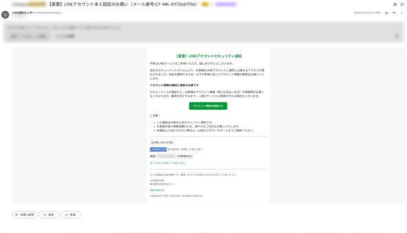 詐欺メールは「【重要】LINEアカウントの再認証が必要です」「【重要】LINEアカウントの乗っ取りにご注意ください」「LINEアカウントに異常なアクセスが検出されました(メール番号:CF-YE-XXXXXXXXXXX)」といった件名で届くという。