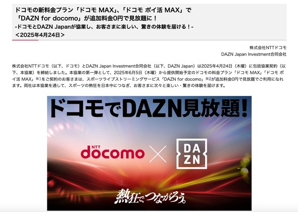 2025年4月24日、NTTドコモとDAZN Japanが業務提携を結んだ。この提携の第1弾として、新料金プラン「ドコモ MAX」「ドコモポイ活 MAX」への加入者を対象に、スポーツ配信サービス「DAZN for docomo」を追加料金なしで利用可能にする。ドコモユーザーが対象の料金プランを契約すれば、月額4200円相当のDAZNが“無料”で見放題になる。