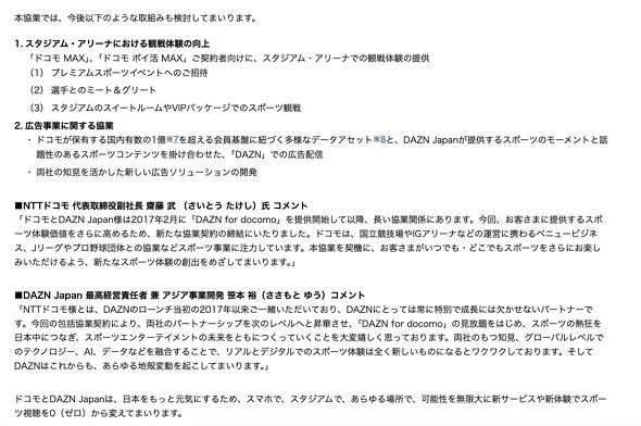 ドコモ副社長の斉藤武氏は、「今回の協業を契機に、より多くのお客さまに新たなスポーツ体験を届けていく」と意気込む。DAZN Japanの笹本裕CEOも、ドコモがパートナーとして欠かせない存在であることを示し、「両社の持つ知見やグローバルレベルでのテクノロジーなどを融合し、リアルとデジタルでのスポーツ体験が全く新しいものになる」と期待感のあるコメントをしている。