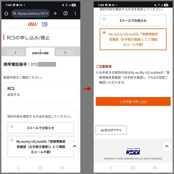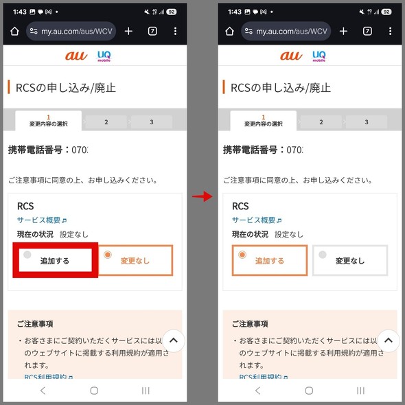 KDDIでは、RCSのサイト、My au アプリ、My UQ mobileアプリなどから無料のRCSオプションサービスに申し込む必要がある。今回はauを例に申し込む手順を記載する。まずauのRCSのサイトから「RCSのお申し込み(無料)」をタップする。