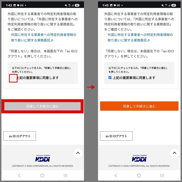 次に「追加する」を選択し、利用規約を確認したら、下にスクロールして「上記の重要事項に同意します」の左側のチェックボックスをタップし、「同意して手続きに進む」をタップする。続いて、「契約内容を確認する方法」を選択したら、「この内容で申し込む」を選択。「受付完了」の画面に進めば、手続きが完了する。