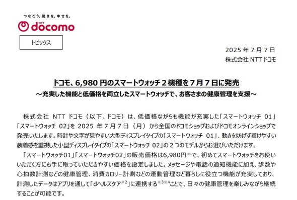 NTTドコモは7月7日、6980円(税込み)という手頃な価格ながら多機能なスマートウォッチ「スマートウォッチ01」「スマートウォッチ02」の2機種を発売した。全国のドコモショップおよびドコモオンラインショップで販売する。突然の発表に発売……狙いは何だろうか?