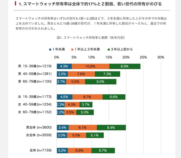 ドコモは、国内のスマートウォッチ普及率は2割弱にとどまっているというデータを挙げ、まだその価値を体験していないお客さまが多く存在しているのが現状と認識している。画像はNTTドコモ モバイル社会研究所の調査資料より引用