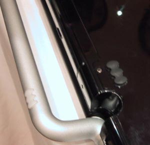 ディスプレイカバー周囲のシルバーのパイプは何気なくめぐらされているように見えるが,「継ぎ目なしにコーナーの曲線を出すのが大変で,水道工事業者からモニュメント制作職人にまで相談した」(同社)という苦心作だ。