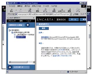具体的には,エンカルタ百科事典の各所から集めてきた情報を「資料BOX」と呼ばれるスペースに格納し,編集,レイアウト調整を行って「Microsoft Word」に書き出すことが可能なほか,文書の末尾には出典情報が自動的に張り付けられる。そのほか,研究レポートの作成方法を指導する機能なども備えているという。