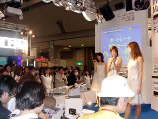 またキヤノンブースでは,IXY DIGITAL 300と同時に発表された昇華型のモバイルプリンタ「CP-10」の専用コーナーを設置し,コンパニオンのお姉さんと撮影した画像をその場でプリントするサービスも行っている。