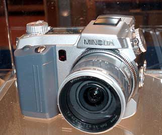 ミノルタのデジタルカメラ「Dimage 7」。28〜200ミリ(35ミリ換算)の7倍光学ズームレンズを備え,570万画素のCCDを搭載するハイエンドモデルだ。ただし,モックアップなのが残念。同社によると,「数カ月以内にキーフィーチャーに関する発表がある」とのこと。