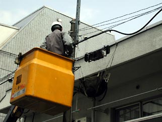 さて工事日当日,実際の引き込み工事はあっけなく開始された。NTT東日本から背広の2人,工事会社から4人,ガードマン1人,ゴンドラ車(高所作業車)を動員して行った。実働部隊は4人,二手に分かれて作業する。200メートルほど離れた幹線道路には,地下から東電の電柱に沿って光ケーブルが立ち上げてあった。そこから筆者宅方向に延ばす作業に2人。