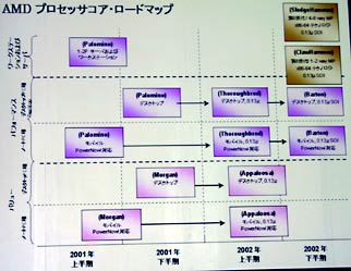 このロードマップでは,PalominoコアのAthlon 4に対し,モバイル版Duronは「Morgan」コアを使用したプロセッサとなっている。しかし,ダイサイズの質問の中で「現在は生産の関係でDuronもPalominoコアであり,早い生産を望むユーザーにPalominoベースでマニュファクチャリングオプションを使うことで対応したもの。したがって現状では,ダイサイズはAthlon 4と同じ」(小島洋一・日本AMDコンピュテーション製品グループ・テクニカル・マーケティング部長)との説明があり,今回のDuronは生産の関係上Palominoコアの製品であることが分かった。今4半期中(4〜6月)にはMorganコアに移行し,ダイサイズも10〜15%小さくなる予定という。