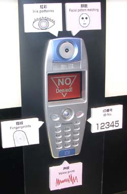 また,NTTドコモが10月より開始する「FOMA」関連では,松下電器産業がFOMA専用アプリケーションとして,虹彩・声紋認証を実演。これは,端末側で虹彩・声紋を取得し,認証サーバにデータを送信するシステムだ。本人であることが確認されれば,オンラインバンキングなどのサービスが利用できる仕組みになっている。