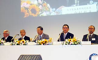 都内ホテルで行われた発表会場には,松下電器の中村邦夫社長,トヨタ自動車の張富士夫社長,トヨタ・モータースポーツのオベ・アンダーソン社長が出席した。