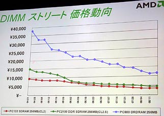 来年以降というのは,より高速なメモリへの移行が見込まれているためである。366MHzの転送レートとなるPC2700 DIMMは,年内に動作確認テストのフェーズに入り,来年の第1四半期には出荷を開始する。これも来年の第2四半期には,現在のPC2100 DIMMと同程度の価格で提供できるようになるという。こうした製品で地ならしをして,次世代DDR SDRAMであるDDR2へと繋げ,そこでハイパフォーマンスメモリとしての利益を得たいという考えだ。