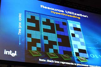 基調講演中に行われたHyperThreadingのデモ(3Dレンダリング)では,おおよそ20〜30%のパフォーマンスゲインがあるように見えた。仮想的にマルチプロセッサのように動作するとはいえ,バスやキャッシュ,そして実行ユニットを共有するためか,物理的なマルチプロセッサほどの効果はないようだ。