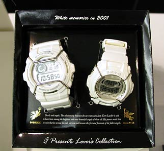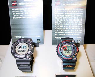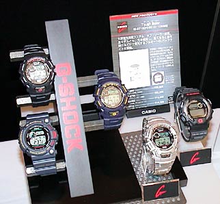 会場では,毎年恒例の「ラバーズコレクション」2001Winterモデルや,蛇殺しの異名を持つカエルをイメージしたモデル,カーボンファイバー調モデルなどG-SHOCKコレクター垂涎の新モデルが注目を集めていた。そのほか,女性用G-SHOCK「BaBy-G」の新ラインアップ,メタルボディの「MT-G」,多色に光るLEDバックライトがお洒落な「G-ms」,アウトドア派の「PRO TREK」などが展示してあり,同社腕時計シリーズの豊富なラインアップを再認識させられた。「G-SHOCKシリーズだけで累計1000モデルに及ぶ。BaBy-Gは別カウントで,こちらも累計800モデルになる」(同社)。恐れ入りました。