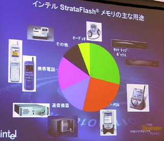 今回のIDFでは,StrataFlashメモリの新製品「3Vシンクロナス インテル StrataFlashメモリ」が発表された。これは通常のフラッシュメモリより読み出し性能が4倍高速で,携帯電話やPDAなどのモバイル機器やSTB,各種通信機器での利用が期待されているという。(詳細記事)