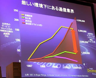 トレーナー氏は「2000年問題」「ドットコムの崩壊」「低迷する経済」という“3つの重要な出来事”によってPC需要が冷え込んでいると分析しながら「買い控えは2002年になれば必ず回復する。欧米では不景気だが中国や南米には影響は見られない。またPCの20年の歴史では,大きな不況を何度も超えながら右肩上がりに成長している」と,PCの長期的な成長には,不況は影響しないことをアピールした。