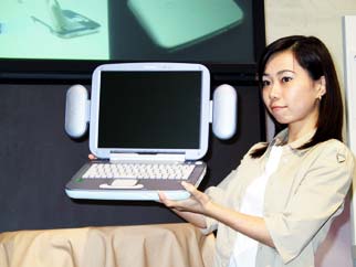 会場の注目を集めていたのが,“耳”付きバイオノート「QR」。音にこだわったQRには,耳のような着脱式のスピーカーが付いた。ディスプレイの両側に,配線無しで取り付けることができる。