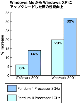 たとえばオフィス系アプリケーションやインターネットアプリケーションのパフォーマンスを計測するSYSmark 2001において,Windows MeとWindows XPのパフォーマンス増加幅を比較した場合,Pentium IIIが6%の改善に留まるのに対してPentium 4は14%改善される。