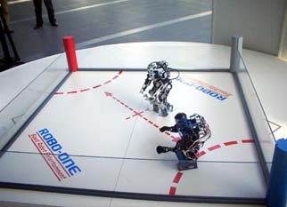 | これが,世界初2足歩行ロボット格闘技のバトルフィールド。もちろん,ROBO-ONEのネーミングはあの「K-1」からきている |