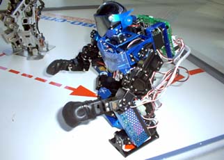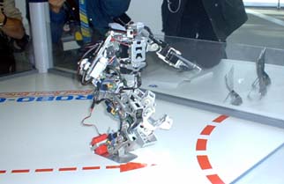 | こちらは,ベストテクノロジーの2足歩行ロボット「フリーダム」。同社サイトで48万円で販売されている。NR-TWO 同様,ROBO-ONEには参加しない。フリーダム同士の熱戦も繰り広げられた |