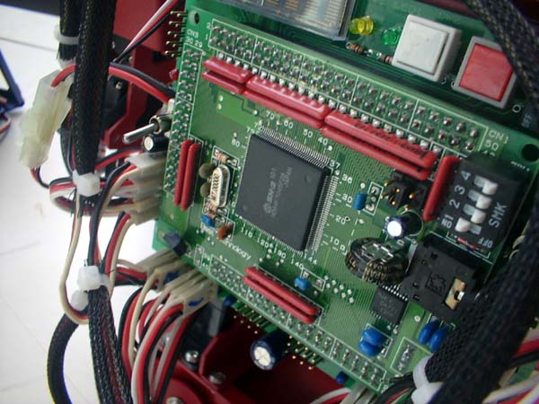 | フリーダムのマイコンボード。CPUに32ビットRISCプロセッサ「SH-2/7045F」を搭載する。「価格的にも手頃で,スペックもこの程度で十分」(五味渕氏)。無線モジュールは,アイ・オー・データ機器のRS-232C無線トランシーバ「WNA-RS(x2)を改造したもの |