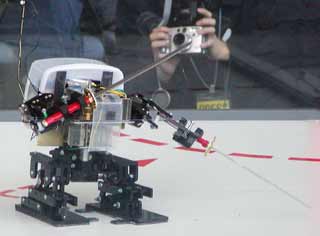 2番目に登場したのが,藤野裕之さんの「TA-17」。背中に背負ったシール容器がキュート(その中にある基板を守っているのだ)。両手に持った日本刀は,切っても切れない安全ナイフだ。もし刃があったらレギュレーション違反になるけど,これなら大丈夫。でも,その刀でペットボトルをなぎ倒すという剣舞を見せてくれた。428点という高得点で全体の3位。