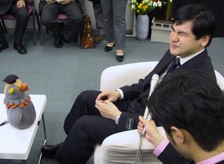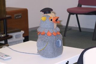 また,対話をするのに話しかける相手が必要ということで,ヌイグルミにマイクを組み込んだミミズク姿の「サポート君」を用意。VoiceXMLの音声制御を含めたシステムの運用には,計5台のPCを使用している。