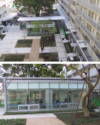 11戸のSOHO住宅は,中庭を囲むように1階住居部分に用意されており,SOHOのコミュニティが形成しやすいようになっている。この中庭には全住宅共用の集会所(有料)も設けられており,業務の打ち合わせ用スペースとして利用できる。