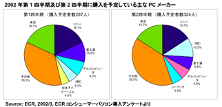 またECRとマーケティング調査会社のGfK Japanが4月4日に発表した調査報告によると,2002年第2四半期(4〜6月)にPCの購入を考えているユーザーが候補に挙げているPCメーカーは,企業市場ではデルコンピュータが,コンシューマー市場ではソニーが最も多かった。
