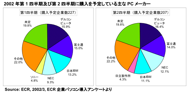 「2002年第1四半期から,コンシューマー市場には回復の兆しが見られるようになったが,ビジネス市場の落ち込みが大きく市場全体ではマイナス成長となった。ただ,第3四半期になれば大企業を中心としてビジネス向けの需要が回復し,プラス成長が期待できる」(ECR)。