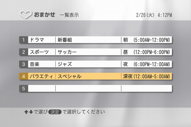 注目は,「おまかせ・まる録機能」。ジャンルやキーワード,時間帯で検索を行い,該当番組を自動的に録画できる。EPGでは放送局側があらかじめ番組のジャンルを「スポーツ/ドラマ/映画/音楽/バラエティー/その他」という6項目にカテゴライズしているが,同機能ではこのジャンルを「ゴルフ/野球/サッカー」,「料理/クイズ/スペシャル」など細かなキーワードで細分化し,さらに時間帯による設定も行える。